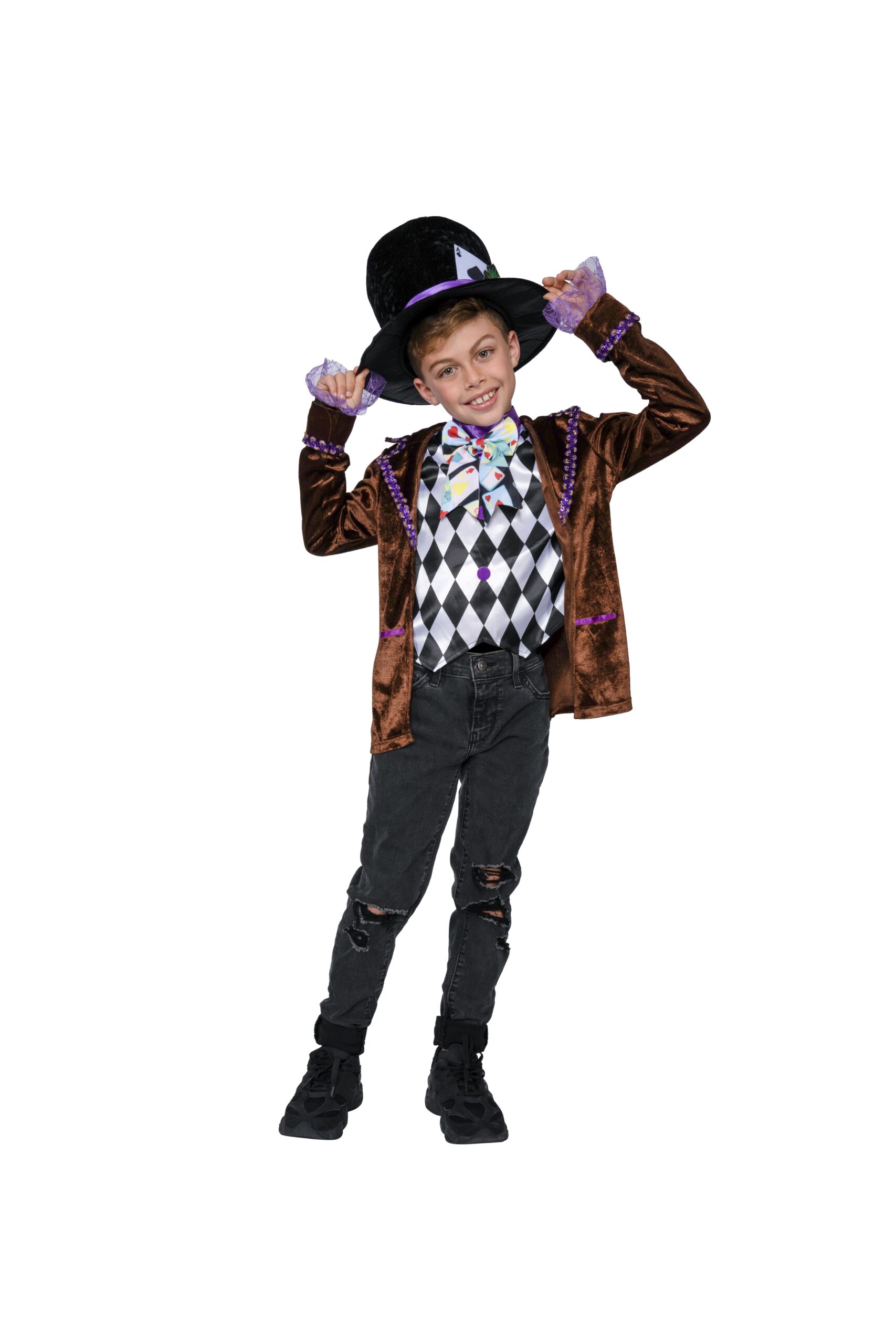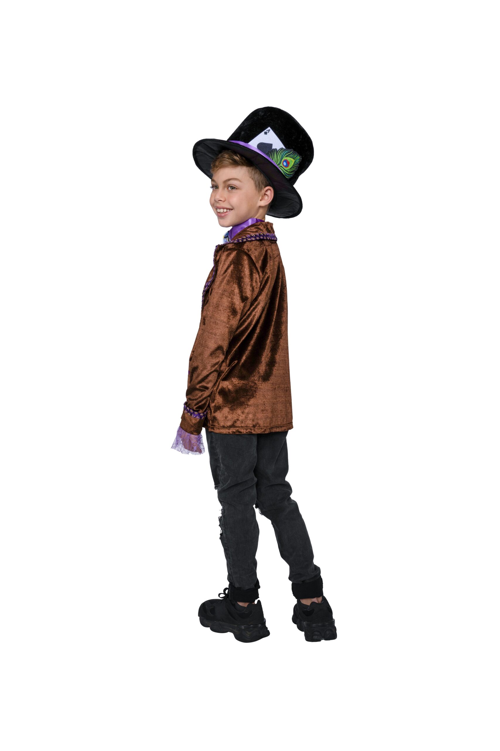 • Crushed velvet hat with satin band and printed felt details.